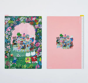 The A5 size depicts animals spending their time in the garden. You can see that there is a lot of cake on the table, and everyone looks so happy. The back side has a background in gentle pink.