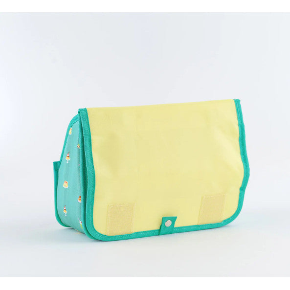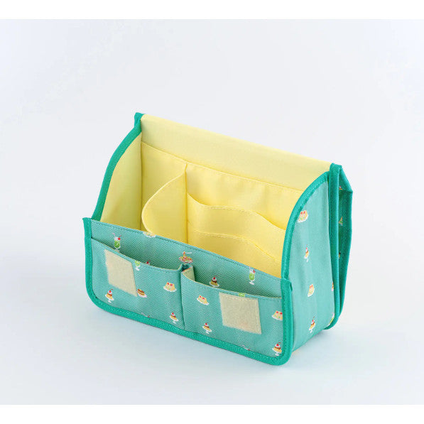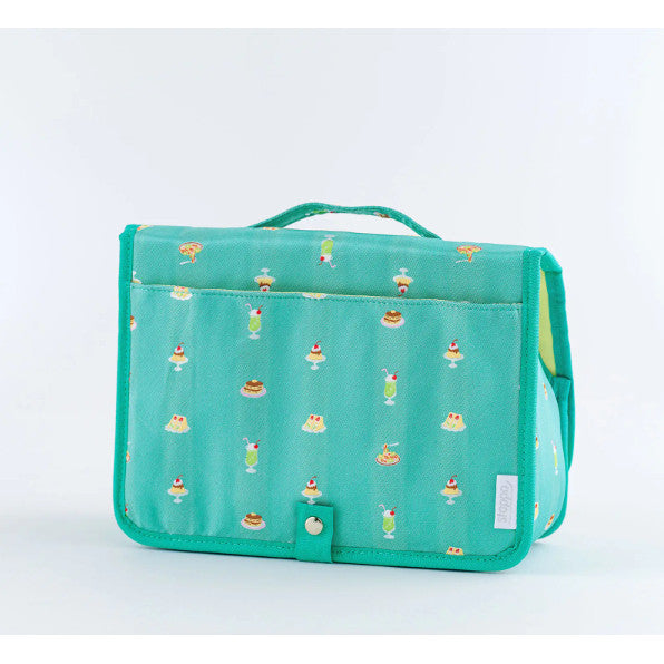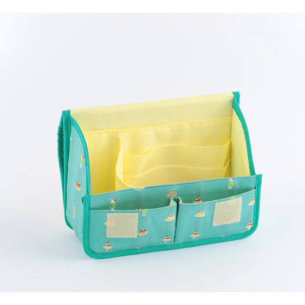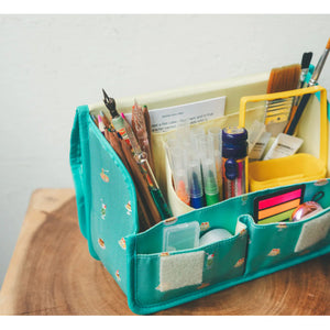 This pouch allows you to store lots of small items on your desk.The name Stappo combines the words Stand and Pouch, as it essentially stores your items in a standing pouch. The curves on both sides of the pouch give it a cute shape.The lid opens wide, so even if you keep a lot of items in the pouch, you can still see what's inside. There's also a handle that makes it convenient for carrying around.There are two pockets that stick out from the front of the pouch. They provide easy access and can hold small but bulky items, such as washi tape rolls and erasers.