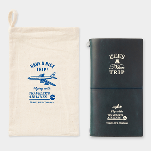 A refill with the image of a boarding pass is set on the Traveler's Note Blue with the Traveler's Airlines logo stamped on it. In addition, it comes with an airplane charm that can be slid when attached to the rubber of the Traveler's Notebook, a charm of a mini-sized tag, a pencil like in-flight goods, a sticker, and a cotton bag that can be used as a storage case for the Traveler's Notebook.
