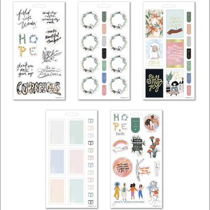Add positive affirmations and colorful designs to your monthly calendars and weekly spreads. This sticker set comes with 5 sheets of transparent stickers with inspirational quotes and colorful designs. Decorated with gold foil accents, these will add a touch of sophistication to your Happy Planner, notebook, or bullet journal. This sticker set was designed by Jena Holliday of Spoonful of Faith