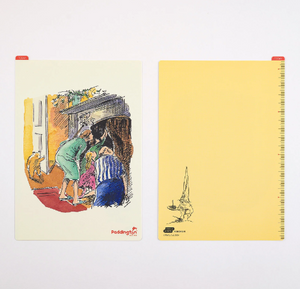 The A5 size pencil board shows a silly scene where Paddington looks on curiously as the Browns search for Paddington inside their fireplace. The back of the board is a soft yellow and shows Paddington heading to bed with his scrapbook he got from the Browns and some cake.