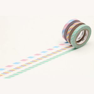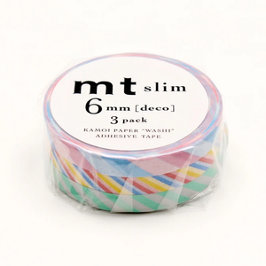 A pretty set of 3 slim washi tapes in a package, perfect for adding cute embellishments to cards and envelopes. These 3 MT Slim when stacked together make up the width of about a standard washi tape, which gives you some idea of how slim they are.