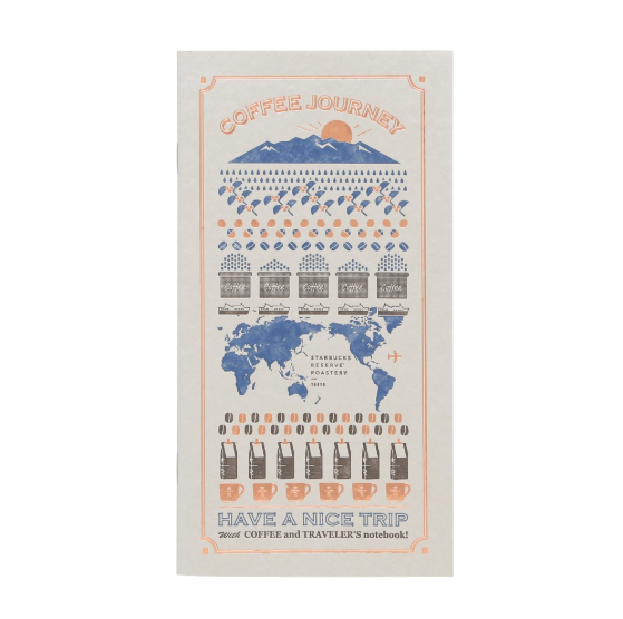 This Traveler's Notebook refill has a cover depicting the "coffee journey" from coffee producing region to a cup of coffee. It is finished with textured print and foil stamping using letterpress printing. The inside notebook section uses a dot grid that is easy to use for various purposes, such as writing or sticking masking tape.