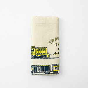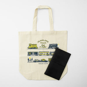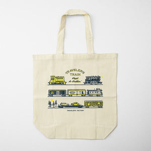 A tote bag designed with the motif of the Traveler's Train, a fictitious sleeper night train departing from the Traveler's Station.