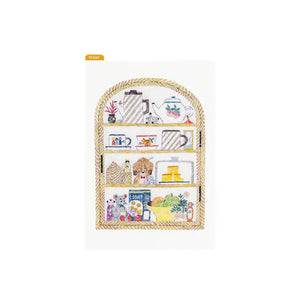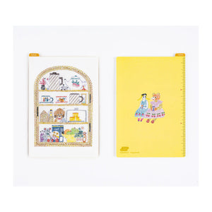 The A6 size design is Teapot Shelf. Teacups and saucers, fruits and biscuits, an hourglass and other such items that are must-haves for tea time are lined up on the shelves. On the back, a little girl wearing a dress and a bear are having a merry little chat.